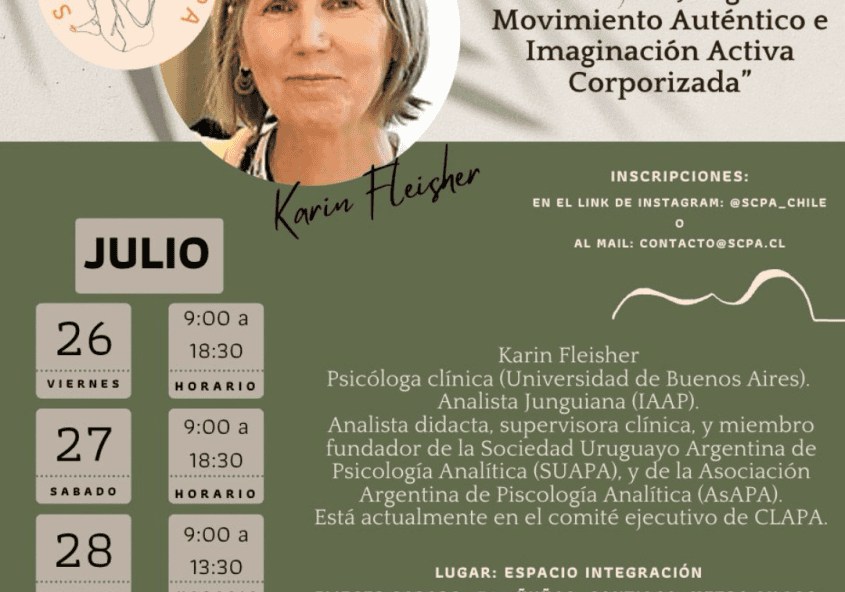 Seminario” La Dimensión somática en el análisis Junguiano - Movimiento Auténtico / Imaginación Activa Corporizada”. Desde la expresión simbólica a los “fenómenos efímeros sensorio-afectivos”. Analista Karin Fleischer, SUAPA. Inicio viernes 26 de Julio 2024. PROPUESTA: La propuesta metodológica del seminario sobre “La dimensión somática en el análisis Junguiano” es teórica-vivencial. En la Unidad I se… -